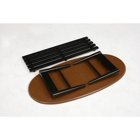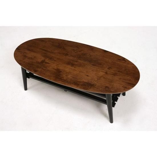 古木調の天板がクールな折れ脚テーブル。棚もついているので雑誌や新聞をストック可能。オーバルサイズ。