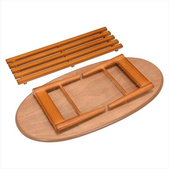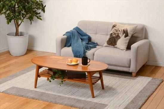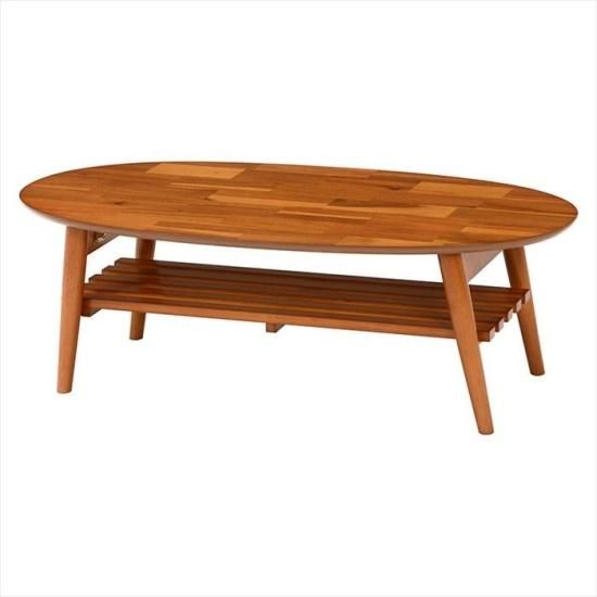 アカシアの木目が美しい折れ脚テーブル。棚もついているので雑誌や新聞をストック可能。オーバルサイズ。