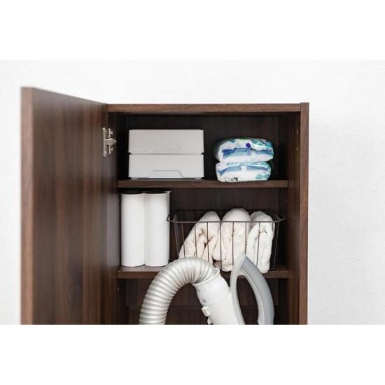 掃除用具がまとめて収納できる掃除機収納庫。背面からコードを通せるので収納時に充電も可能です。