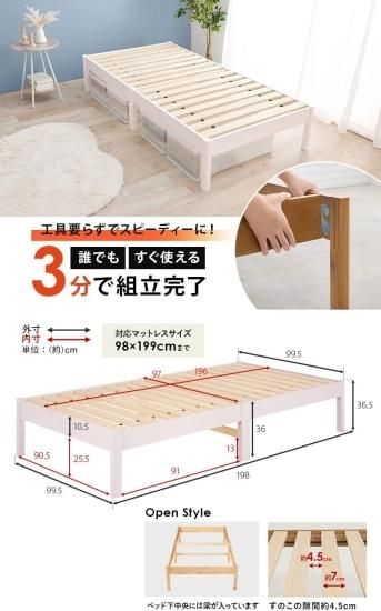 ネジや工具不要で簡単組立!宮棚がなくスッキリシンプルなデザインのシングルベッドです。厚手のすのこ使用で、耐荷重200kgで強度もバッチリです。木のぬくもりを感じる天然木パイン材を贅沢に使用。ベッド下も大容量の収納スペースとして活用できるので、収納の少ないお部屋にもおすすめです!カラーは、ライトブラウン、プレーンナチュラル、ウォッシュホワイトの3色からお選び頂けます。